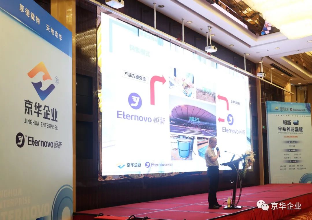 在接下來的一小時(shí)時(shí)間里,京華企業(yè)“恒新“品牌營(yíng)銷副總李明曄先生,從企業(yè)實(shí)力和品牌定位,新型鋅鋁鎂基材以及全系列”恒新“彩涂產(chǎn)品線,”恒新“產(chǎn)品定制服務(wù)三方面向與會(huì)嘉賓做了全面的講解,全方位立體化向大家詳細(xì)闡述了”恒新“產(chǎn)品解決方案的獨(dú)特價(jià)值,以創(chuàng)新設(shè)計(jì)理念,幫助綠色建筑的節(jié)材,節(jié)水,節(jié)能,提升環(huán)境舒適度等各方面達(dá)成極大提升,以綠色理念幫助廣大客戶實(shí)現(xiàn)彩涂產(chǎn)品銷量的可持續(xù)增長(zhǎng)。
