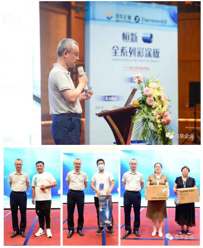 在接下來(lái)的一小時(shí)時(shí)間里,京華企業(yè)“恒新”品牌營(yíng)銷副總李明曄先生,從企業(yè)實(shí)力和品牌定位,新型鋅鋁鎂基材以及全系列“恒新”彩涂產(chǎn)品線,“恒新”產(chǎn)品定制服務(wù)三方面向與會(huì)嘉賓做了全面的講解,全方位立體化向大家詳細(xì)闡述了“恒新”產(chǎn)品解決方案的獨(dú)特價(jià)值,以創(chuàng)新設(shè)計(jì)理念,幫助綠色建筑的節(jié)材,節(jié)水,節(jié)能,提升環(huán)境舒適度等各方面達(dá)成極大提升,以綠色理念幫助廣大客戶實(shí)現(xiàn)彩涂產(chǎn)品銷量的可持續(xù)增長(zhǎng)?,F(xiàn)場(chǎng)的客戶們表示認(rèn)可與支持,對(duì)于“恒新”品牌給用戶帶來(lái)的賦能升級(jí),轉(zhuǎn)型共生,給予了很高的期待! 隨后,李總就現(xiàn)場(chǎng)嘉賓提出的問(wèn)題做出了詳細(xì)解答,并隨機(jī)從提問(wèn)的嘉賓中抽取多名幸運(yùn)嘉賓,贈(zèng)與豐厚禮品,平板電腦、蒸汽拖把等大獎(jiǎng)一一揭曉,現(xiàn)場(chǎng)氣氛熱烈愉快。